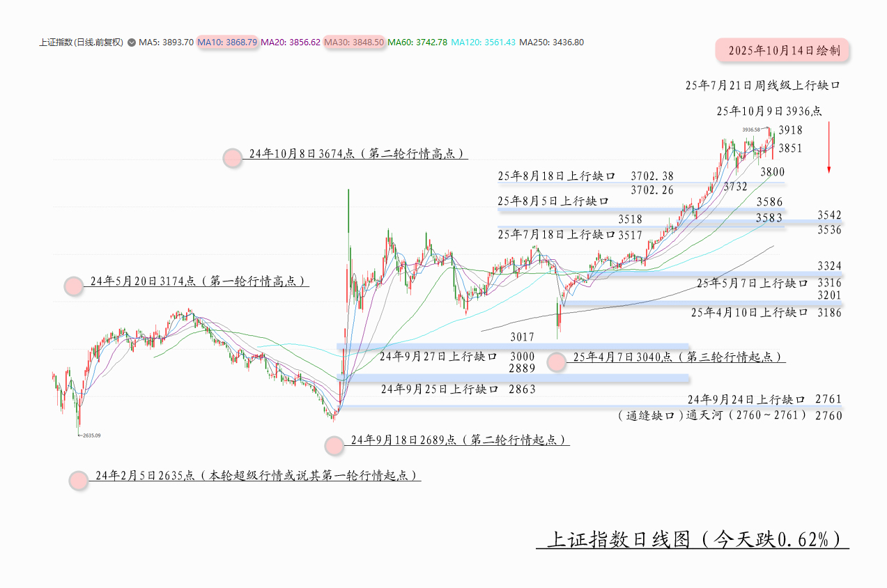 今天(25年10月14日,周二),上证指数承袭今天大幅低开96点或说2。49%之后几近收复全数失地的余威,竟然以升21点或说0。55%的3910点高开,最高升至3918点,距国庆节后首个买卖日也即上周四(25年10月9日)创出的本轮超等行情24年2月5日2635点启动以来的新高3936点仅差18点,最低回调至3851点,迫近30天线天线%。